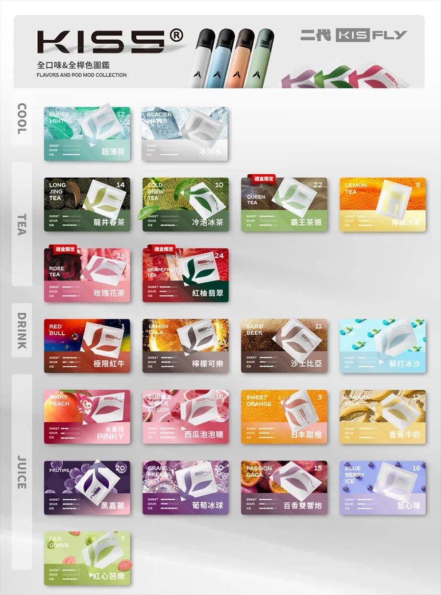 凱斯KISS FLY五代電子煙彈通用5代主機,每個口味都提供純正的口感體驗,滿足不同用戶的需求,讓您享受更多吸煙樂趣。KISS煙彈採用先進技術和優質材料,確保每一口都安全、純正。KISS FLY 五代電子煙煙彈,全新升級,口感更飽滿!21種口味可選,從清爽水果到濃醇茶感,滿足不同喜好。2.0ML大容量,陶瓷芯霧化技術,穩定霧化,順滑口感。